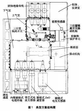 (1)高壓主電路的氣體絕緣技術(shù)和插接技術(shù):對主電路電場進行了優(yōu)化,以低壓力SF6氣體作絕緣介質(zhì);開發(fā)了內(nèi)錐、外錐插接式電纜終端頭,插接式固體絕緣母線,采用硅橡膠絕緣的十字銜接套,端頭T形銜接套,插接式電壓互感器和避雷器。