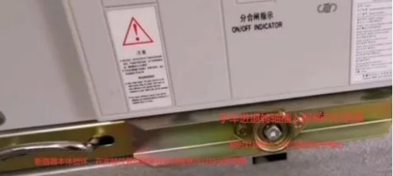 6,上圖為斷路器本體鎖環,圖中為斷路器試驗方位,從檢修方位推入試驗方位時,把兩頭鎖環往中心推把鎖環翻開,推入到試驗方位時,松開鎖環鎖環就翻開鎖在試驗方位,當要從試驗方位推入到工作方位時,將兩頭鎖環往中心推翻開鎖環,這時順時針搖入斷路器到工作方位。