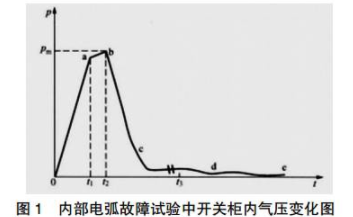 內部故障產生的破壞力與電弧產生的間隔容積,電弧電壓,持續(xù)的時間,短路電流大小有關。在電弧產生后,柜體內的壓力過程如圖1所示,壓力過程可以分為四個物理階段風圖1。
