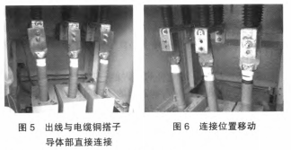 穿墻套管下部為出線,與電纜銅搭子導體部直接連接,如圖5所示。拆除連接螺栓后發(fā)生連接位置移動,如圖6所示。此現(xiàn)象說明電纜銅搭子與穿墻套管存在很大的連接變形,并產(chǎn)生應(yīng)力,在電纜通電后產(chǎn)生的電動力和連接應(yīng)力進一步作用于穿墻套管,使得穿墻套管發(fā)生碎裂。